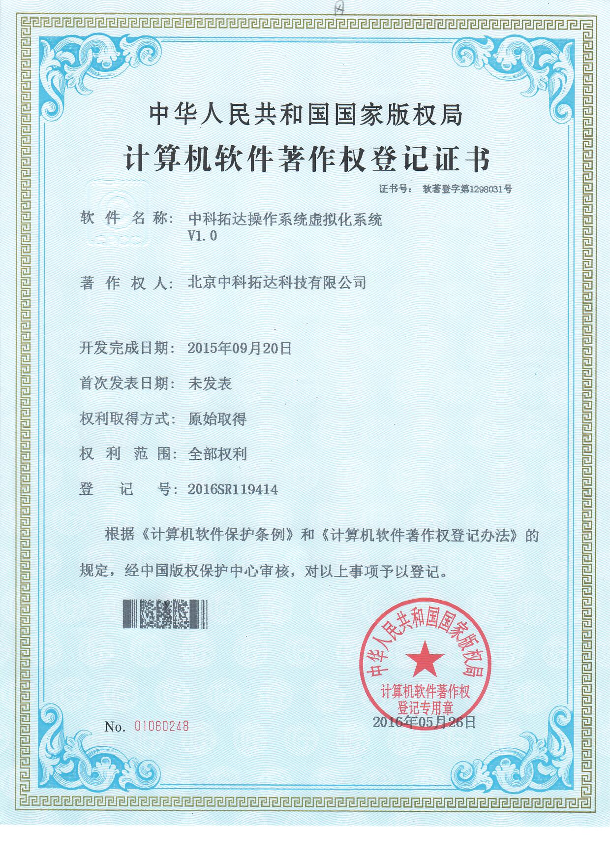 中科拓達(dá)操作系統(tǒng)虛擬化系統(tǒng)軟件證書(shū)